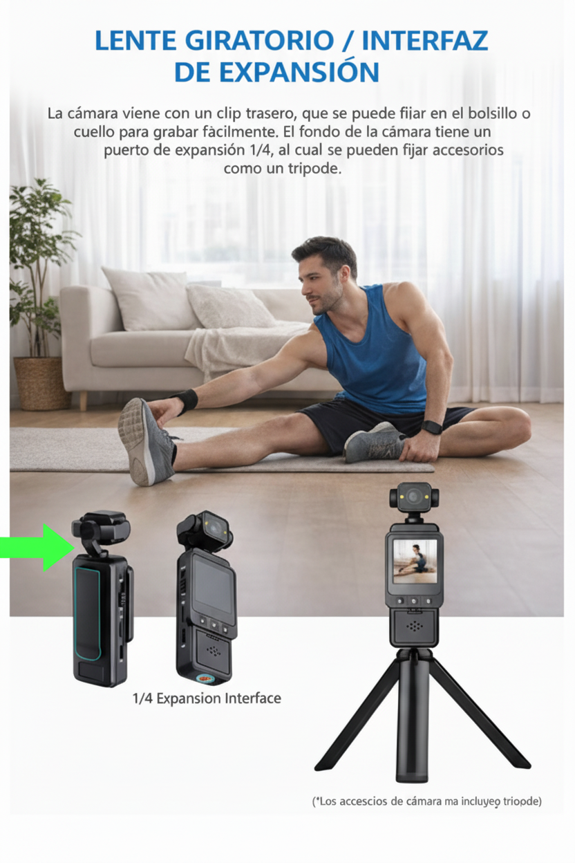 Permite fijar la cámara en bolsillo, cinturón, mochila o ropa para grabación manos libres.